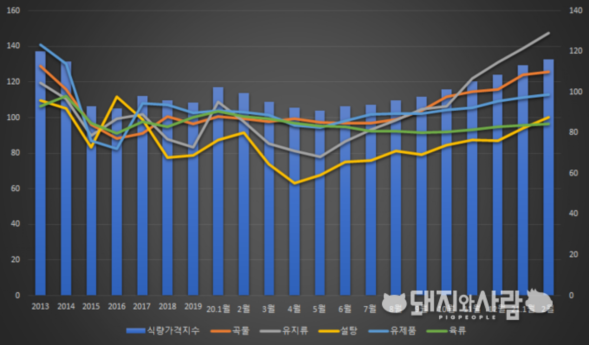 2월 세계식량가격 9개월 연속 상승...돼지고기는 하락 '21년 2월 세계식량가격지수 전월보다 2.4% 상승한 116.6포인트 기록, 전년동월 대비 16.7% 상승 세계식량가격이 2월에도 상승폭은 줄었지만, 여전히 증가세를 이어갔습니다. ▲ 연도별 세계식량가격지수 및 품목별 가격지수@FAO 자료 편집 유엔식량농업기구(FAO)에 따르면 2월 세계식량가격지수는 전월(113.2포인트)보다 2.4% 상승한 116.0포인트를 기록했습니다. 이는 지난해 5월 이후 9개월 연속 상승이며, 2015년 이래 역대 최고로 높은 수치입니다. 육류, 유제품, 곡물, 유지류, 설탕 등 품목별 가격지수도 어느 하나 빠진 것없이 모두 증가했습니다. 전년동기 대비 하락한 품목은 육류가 유일합니다. ▲ 1월 육류(96.0.→95.8), 유제품(111.0→111.1) 가격이 보정되어 1월 식량가격지수 조정(113.3→113.2) 육류는 1월(95.8포인트)보다 0.6% 상승한 96.4포인트를 기록해 5개월 연속 상승했습니다. 하지만, 이는 전년동월보다 4.1% 하락한 수준입니다. 구체적으로 쇠고기와 양고기는 가격이 상승했고, 돼지고기와 가금육은 하락했습니다. 쇠고기 및 양고기는 오세아니아에서 수급조절을 위해 사육을 늘리고 가공을 줄이면서 공급량이 감소하여 가격이 상승하였습니다. 돼지고기의 경우 중국의 수입량이 감소하고, 독일산 돼지고기의 아시아 지역 수출 금지로 독일 내 돼지두수가 증가함에 따라 가격이 하락하였습니다. 가금육은 중국의 수입량 감소에 영향을 받아 가격이 하락하였습니다. 최근 가장 큰 관심 품목인 곡물의 경우 1월(124.2포인트)보다 1.2% 상승한 125.7포인트를 기록했습니다. 전월 상승폭(7.2%)보다 상승률이 소폭 하락했습니다. 하지만, 이는 전년동기보다 26.5% 높은 수치입니다. 옥수수는 전월보다 0.9% 상승해 전년동기보다 45.5% 높은 가격을 보였습니다. 세계수출물량이 감소하고, 수입 수요가 높아 가격이 상승한 것으로 분석되었습니다. 그외 유지류와 유제품, 설탕은 각각 147.4, 113.0, 100.2포인트를 기록했습니다. 이는 전월보다 각각 6.2%, 1.7%, 6.4% 증가한 가격입니다. 한편 FAO 식량가격지수는 ’90년 이후 23개 품목에 대한 국제가격동향(73개)을 모니터링하여, 5개 품목군(곡물, 유지류, 육류, 유제품, 설탕)별로 매월 작성해 발표하는데 2002-2004년 평균을 '100'으로 기준으로 합니다. 자료 원문은 FAO 홈페이지(http://www.fao.org/worldfoodsituation/foodpricesindex/en)에서 확인할 수 있습니다. [출처: 돼지와사람 2021. 3. 7.] |
