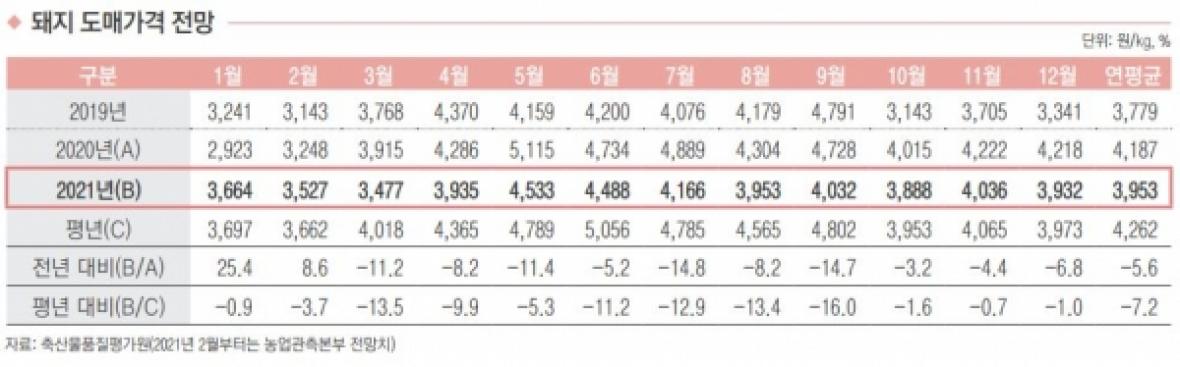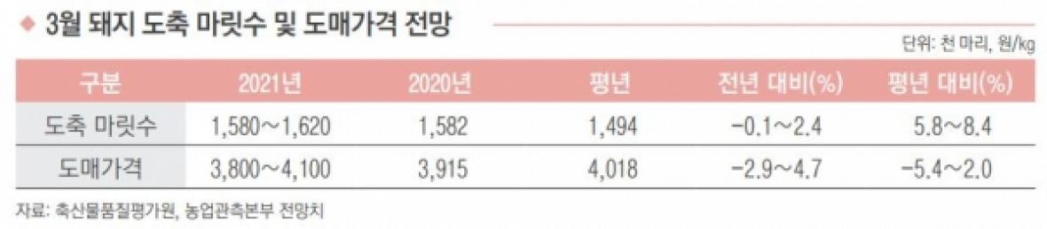 최근 농촌경제연구원은 3월 양돈관측을 통해 이달 평균 돼지도매가격이 3800~4100원으로 지난해 동월(3915), 평년(418) 대비 하락할 수 있다고 전망했다. 전년 동월보다 각각 25.4%, 8.6% 상승했던 1~2월과 비교하면 상승세가 꺾이는 것은 물론이고 하락세로 돌아설 가능성을 더 높게 본 것이다. 농경연은 이와 관련, 코로나 확산 상황 변화에 따른 소비 심리, 생활형편 변화 등 가격 변동 요인이 잠재해 있다고 덧붙였다.