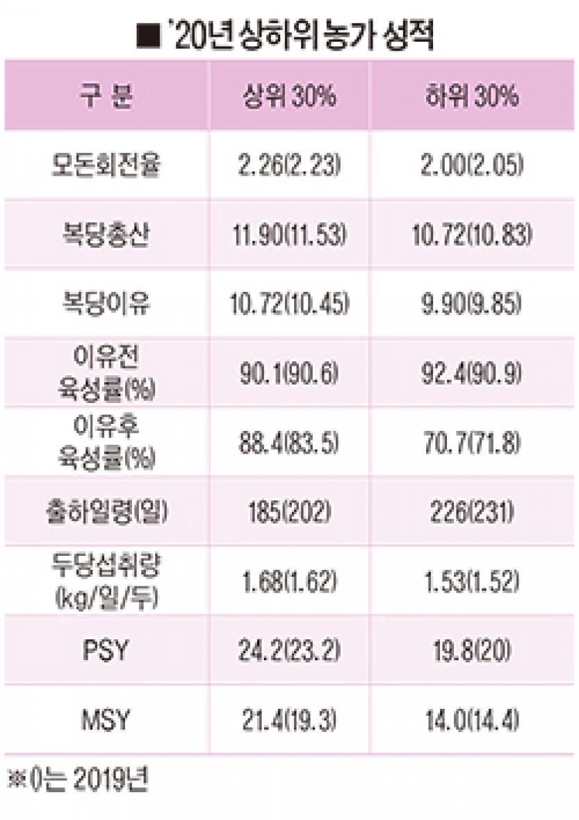 농가 수익에 직접적인 영향을 미치는 MSY의 경우 지난해 상위 30%농가가 21.4두로 하위 30%농가 보다 7.4두가 많았던 것으로 분석됐다.