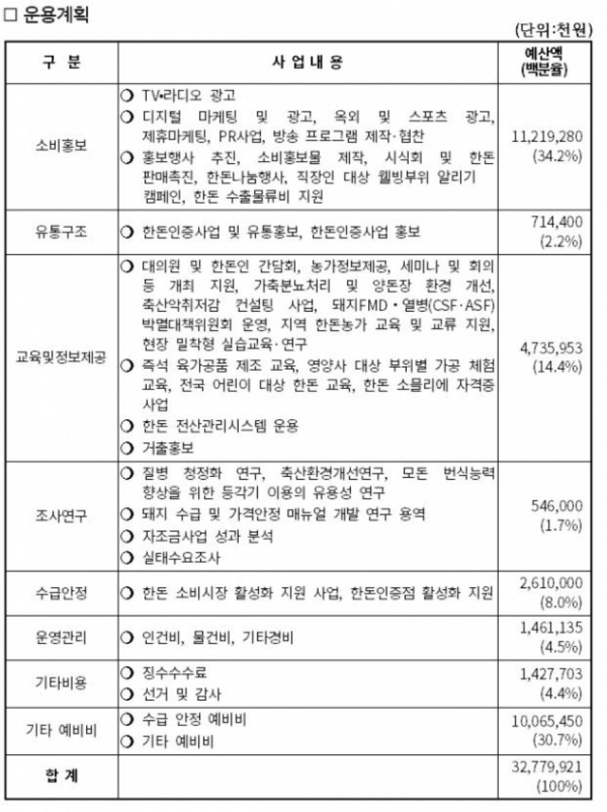 이에 따라 올해 자조금 사업 운용은 소비홍보(34.2%)=1123천만원 유통구조개선(2.2%)=71천만원 교육 및 정보제공(14.4%)=473천만원 조사연구(1.7%)=54천만원 수급안정(8.0%)=261천만원 운영관리비(4.5%)=146천만원 기타 예비비 (30.7%)=100억 등으로 사용될 계획이다. 특히 소비 홍보 사업의 경우 처음으로 100억원 넘게 책정됐다. 이는 일부 수급 안정 사업을 소비 홍보 사업으로 편입했기 때문이다.