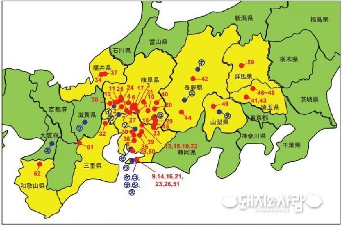 일본 CSF 농장 발생 지도(이번 63,64번째 미표기, #62 올해 126일 발생)@농림수산성