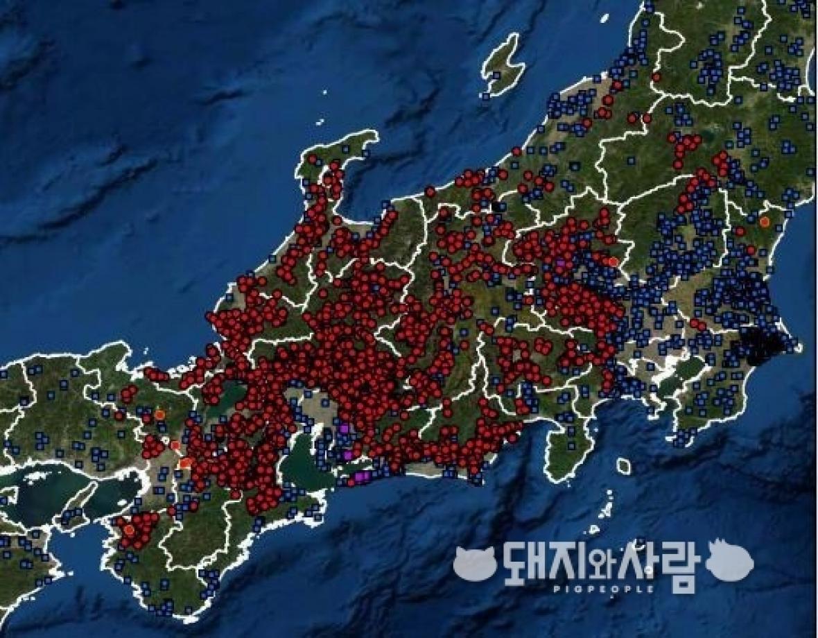 3.24 기준 야생멧돼지 CSF 발생지도(빨간원), 보라색은 CSF 발생농장, 파란색은 농장@일본 농림수산성