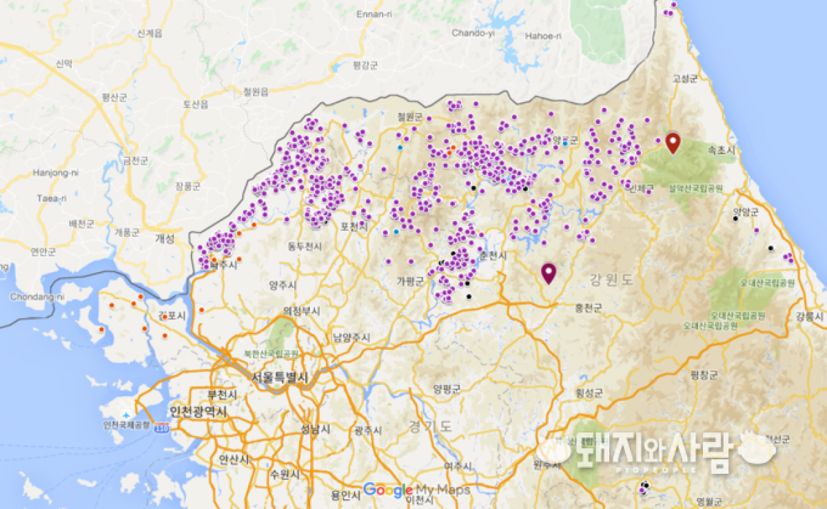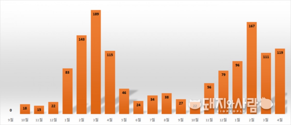 4월 ASF 멧돼지 땅따먹기 거침없네 4월 멧돼지 ASF 발생 119건, 전년동기 및 전월 대비 증가...홍천, 설악산, 파주 민통선 밖 등 신규 지역 추가 국내 야생멧돼지를 통한 ASF 확산 양상을 아이들 놀이인 '땅따먹기'에 비유하기도 합니다. 양성 멧돼지의 이동으로 인해 하룻새 비발생지역이 발생지역으로 바뀌고, ASF 발생지역(땅)이 점차 넓어지니 말입니다. 4월에도 이들 멧돼지의 땅따먹기는 계속 이어졌습니다. 양성멧돼지 수가 다시 늘었습니다. 홍천이 새로운 발생시군으로 추가되었습니다. 그나마 다행스러운 것은 모든 발생지점이 정부의 차단울타리 내라는 점입니다. 이전과 마찬가지로 4월 ASF 발생 상황에 대해 환경부나 농림축산식품부 등이 따로 보고하지 않을 것으로 예상되는 바 '돼지와사람'이 간단히 정리했습니다. 4월 야생멧돼지 ASF 발생, 전월 및 전년동월대비 모두 증가 지난달 일반돼지에서의 ASF 발생은 '20년 10월 화천 이후 여전히 없는 가운데 야생멧돼지에서의 발생은 119건이 새로 추가되었습니다. 이는 전월(111건)뿐만 아니라 전년동월(115건) 보다 모두 증가한 수준입니다. ![]() ▲ 월별 야생멧돼지 ASF 발생건수@돼지와사람 편집 전월인 3월은 4개월 연속 양성멧돼지의 증가세가 멈추고, 감소한 달로서 혹시나 또 감소할까 하는 기대감을 갖게 했습니다. 하지만, 기대와 달리 실제 다시 증가함으로써 4월이 멧돼지의 본격 출산기(4~5월)임을 상기시켰습니다. 119건을 지역별 발생건수로 보면 춘천이 41건으로 가장 많습니다. 이어 연천 25, 화천 13, 인제 12, 포천 11, 가평 10건 등 순입니다. ▲ 국내 ASF 발생지도(주황색 일반돼지, 보라 및 파랑, 검정 멧돼지)@구글 지도, 돼지와사람 편집 강원 홍천, 첫 감염멧돼지 확인....역대 14번째 발생시군 지난달 20일 강원도 홍천군 화촌면 성산리 산중턱에서 주민에 의해 발견(4.16)된 폐사체에 대한 검사 결과 최종 ASF 양성(#1359)이 확진되었습니다. 홍천 첫 사례이며, 이로서 멧돼지에서의 ASF 발생시군은 모두 14곳으로 늘었습니다. 이날 방역당국은 홍천을 비롯해 인접 7개 시·군 - 춘천, 인제, 양평, 횡성, 평창, 홍천, 양양 등에 대해 ASF 위험주의보를 발령했습니다. ASF 감염 멧돼지, 설악산 국립공원에서 결국 발견 홍천에 이어 다음날 21일에는 인제군 북면 용대리, 내설악 백담계곡 부근에서 등산객에 의해 발견(4.19)된 멧돼지 폐사체(#1372)도 ASF 양성으로 확진되었습니다. 마침내 우려가 현실이 된 것입니다. 국립공원에서의 멧돼지 포획이나 수렵은 사실상 불가능합니다. 설악산은 백두대간의 큰 줄기로 태백산과 속리산 지리산 등과 이어져 있습니다. ASF의 전국화 가능성을 높이고 있습니다. 이런 가운데 홍천과 마찬가지로 설악산 확진 사례에도 불구, 환경부 등 정부는 아직까지 별다른 대응방안을 내놓지 않고 있습니다. 파주 민통선 밖, 연인산 도립공원에서도 첫 감염멧돼지 이밖에 경기도 파주 민통선 밖에서 처음으로 ASF 멧돼지(#1385, #1400)가 확인되었습니다. 지금까지 파주의 양성멧돼지는 모두 100건으로 이번 2건을 제외하고 모두 민통선 내에서 나온 것입니다. 경기도 가평에 소재한 연인산 도립공원에서도 ASF 멧돼지(#1402)가 처음으로 확인되었습니다. 도립공원에서는 첫 사례입니다. 연인산은 높이가 1,068미터이며 도립공원의 면적은 37.4㎢입니다. 경기도의 대표적인 등산 관광지입니다. 가평은 지난해 11월 28일 첫 감염멧돼지가 확진되었습니다. 한편 4월까지 누적 ASF 발생은 모두 1,420건입니다. 일반돼지 16건, 멧돼지 1404건입니다. 멧돼지의 지역별 발생은 연천 408, 철원 36 파주 100, 화천 419, 양구 66, 고성 4, 포천 82, 인제 78, 춘천 157, 가평 30, 영월 11, 양양 8, 강릉 3, 홍천 1 등입니다. ![]() ▲ ASF 야생멧돼지 발생지점 및 울타리 설치 현황@ASF 중수본 [출처: 돼지와사람 2021. 5. 2.] |