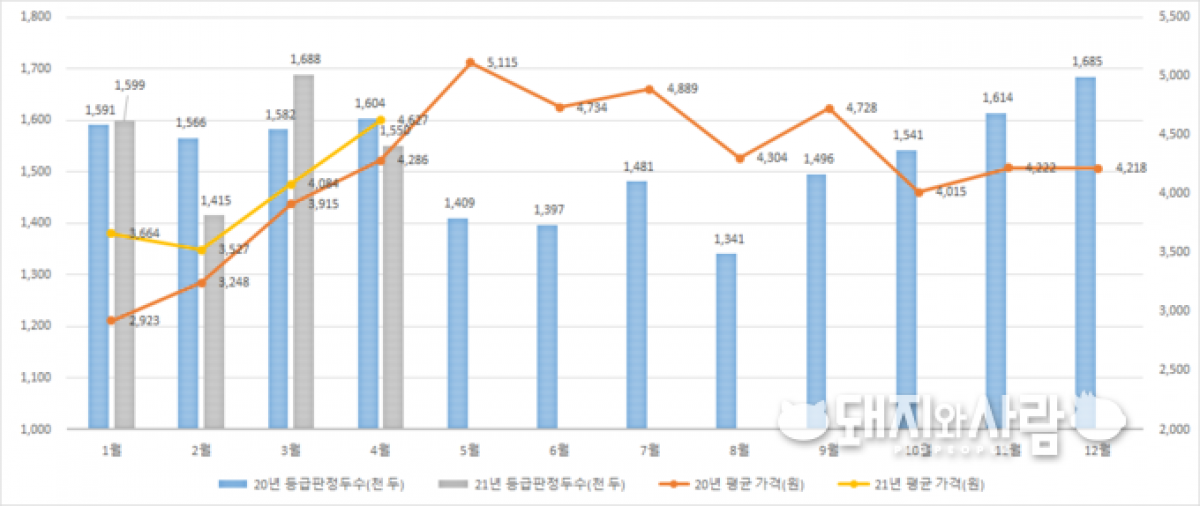 지난달 4월 돼지고기, 국내 생산·수입 모두 줄었다 4월까지 누적 등급판정두수 1.4%, 수입량 12.6% 각각 감소...평균 도매가격 4,627원 기록, 전년동기대비 8.0% 증가 지난달 돼지고기가 국내 생산과 수입 모두 감소한 것으로 나타났습니다. 이런 가운데 돼지고기 평균 도매가격은 5천 원 가까이 상승했습니다. ![]() ▲ '21년 월별 돼지고기 국내 생산량 및 수입량(단위 만 톤)@돼지와사람 편집 축산물품질평가원 자료에 따르면 4월 돼지 전체 등급판정두수는 155만 71두입니다. 이는 전년동기보다 3.3%(5만 3,721두) 적은 수준입니다. 전월과 비교해서는 8.2%(13만 8,074두) 감소한 결과입니다. 누적으로도 감소했습니다. 4월까지 총 돼지 등급판정두수는 625만 2,947두입니다. 이는 전년동기보다 1.4%(9만 54두) 적은 숫자입니다. ▲ '20년과 '21년 월별 등급판정두수(단위 천두)와 평균돈가(단위 원)@돼지와사람 편집 올해 등급판정두수가 감소한 원인은 지난해 국내 돼지 사육두수, 특히 모돈두수('20년 1분기 104만→4분기 100만)가 감소한 원인으로 풀이됩니다. 4월 돼지고기 수입도 감소했습니다. 식품의약품안전처에 따르면 지난달 돼지고기 수입량은 모두 2만 8,350톤입니다. 이는 전월보다는 2.0%(558톤) 늘어난 것이지만, 전년동기와 비교하면 9.6%(3,013톤)나 줄어든 수준입니다. 누적으로 보면 감소폭은 더욱 커집니다. 4월까지 누적 돼지고기 수입량은 10만 1,023톤입니다. 전년동기와 비교하면 12.6%(1만 4,554톤)나 감소한 것으로 파악됩니다. 수입육 감소의 원인은 국제 돼지고기 가격 상승에 따른 높아진 수입단가가 1차 요인이라는 분석입니다. ![]() ▲ 4월 돼지 등급판정두수 및 경매두수, 경매가격(단위 두, 원)@돼지와사람 편집 이같은 영향으로 4월 평균 돼지고기 도매가격(kg 당, 제주 및 등외 제외)은 4,627원을 기록했습니다. 1일 4,477원으로 출발해 30일 4,944원까지 상승했습니다. 4,627원은 전월대비 13.3%(543원), 전년동기대비 8.0%(341원) 높은 가격입니다. ![]() ▲ 4월 국산 및 수입 삼겹살 소매가격(100g, 중품 기준, 단위 원)@돼지와사람 편집 이에 따라 돼지고기 소매가격도 증가했습니다. 지난달 1일 국산 삼겹살과 수입 삼겹살 소매가격(100g 중품 기준)은 각각 2,149원과 1,245원이었습니다. 30일에는 2,392원, 1,273원을 기록, 각각 11.3%, 2.2% 증가했습니다. [출처: 돼지와사람 2021. 5. 3.] |