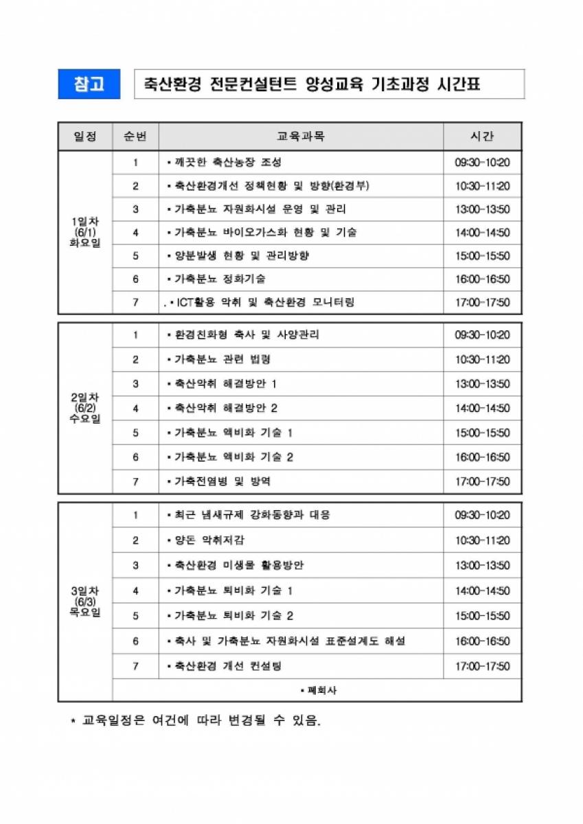 축산환경 전문컨설턴트 양성교육 기초과정 시간표 <자료제공=축산환경관리원>