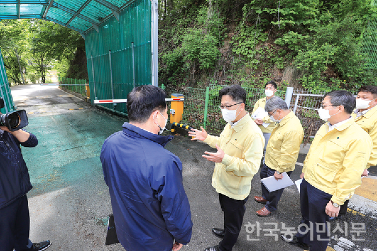 영월군 주천면 양돈 농장에서 아프리카돼지열병이 발생한 가운데, 김현수 농식품부 장관이 6일 충북 소재 모돈 도축장을 방문해 방역실태를 점검했다.