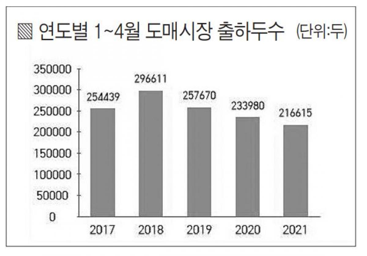 4월말까지 도매시장 경락두수가 역대 최저를 기록했다.