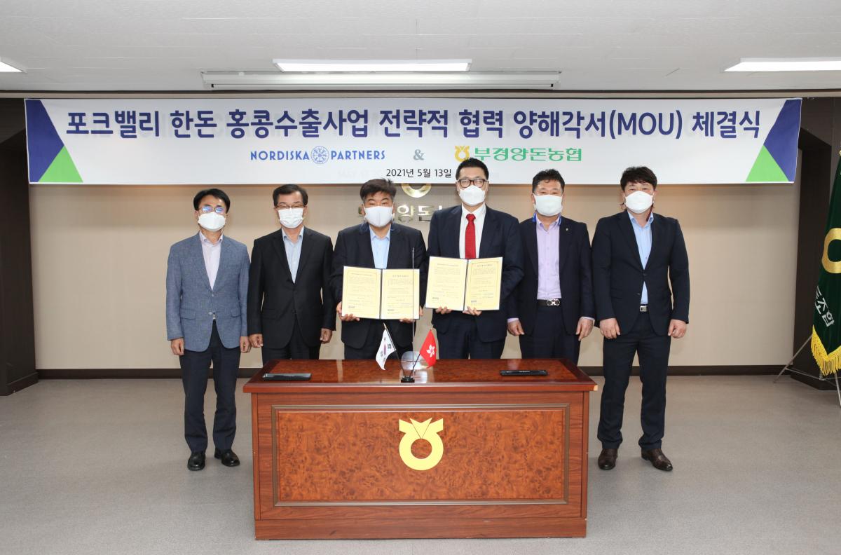 부경양돈농협(조합장 이재식)513일 노르디스카 파트너스와 포크밸리한돈 홍콩수출 물량확대를 위해 부경양돈농협 이재식 조합장과 노르디스카 한국대표부 엠코 김중완 대표가 참석해 양해각서(MOU)에 서명하였다.