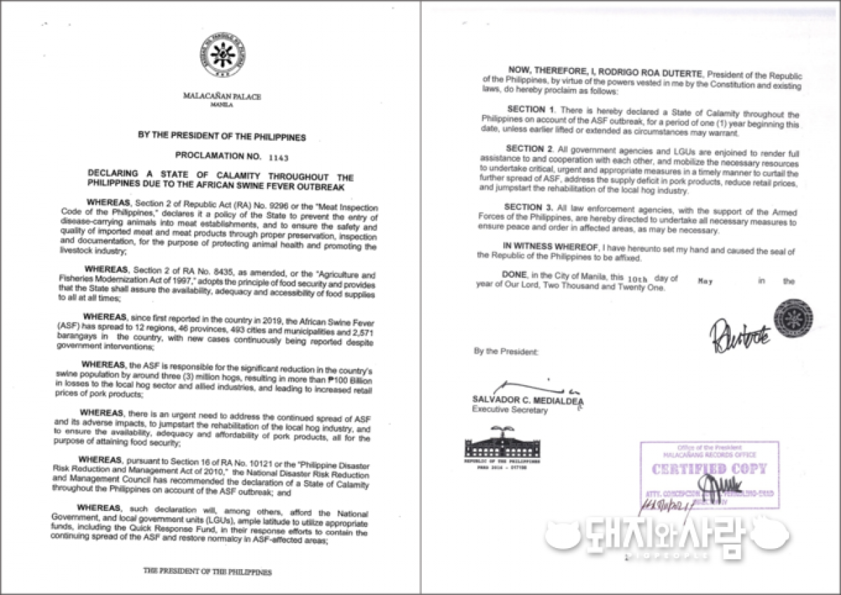 필리핀 정부는 지난 10일 두테르테 대통령이 ASF의 추가 확산을 줄이고, 돼지고기 제품의 공급 부족을 해결하고, 지역 돼지산업의 재활을 촉진하기 위해 필리핀 전역에 1년간 ASF 관련 재난을 선포하는 선언문(No.1143)에 서명했다고 11일 밝혔습니다.