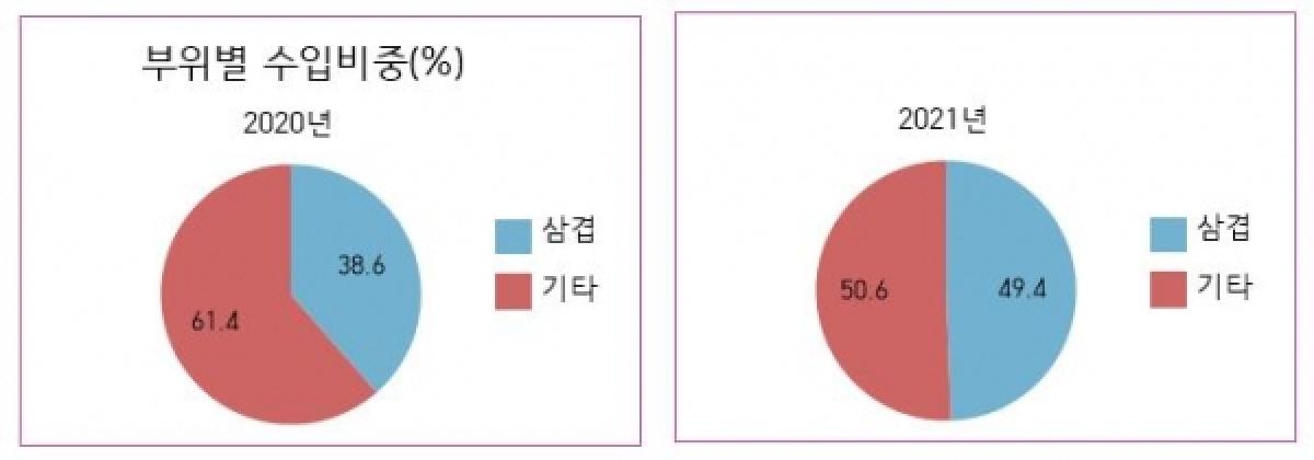 부위별로도 차이가 컸다. 대부분의 부위들이 지난해보다 큰 폭으로 준 반면 4월 삼겹살 수입물량은 14500톤으로 전년 동월(11천톤)보다 32.3% 늘었으며 4월말 기준으로는 5만여톤이 수입돼 일년전(45천톤)보다 11.8% 증가했다. 전체 수입물량은 줄었지만 이처럼 삼겹은 증가하면서 4월말 기준 삼겹살 비중은 49.4%로 지난해 38.6% 대비 무려 10%P 이상 올랐다. 4월만 보면 삼겹살 비중이 51.2%를 차지하면서 지난 2월을 제외하고 올해 모두 삼겹 비중이 절반을 넘었다.