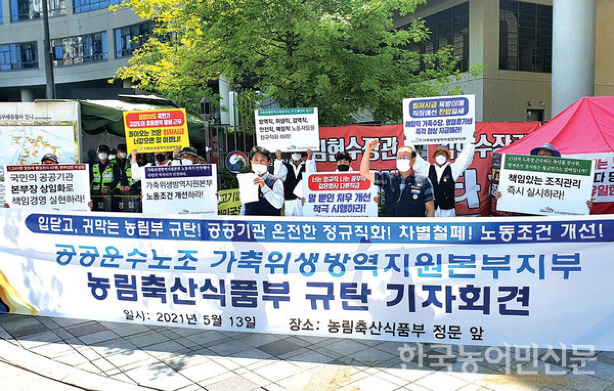 이에 방역본부 노동조합은 13, 세종시 농림축산식품부 앞에서 기자회견을 열고, 방역본부 현장 인력 정규직화 및 근무 여건 개선을 촉구했다. 처우 개선 문제를 논의하기 위해 수차례 상급기관인 농식품부 면담을 시도했으나 농식품부가 이를 계속 거부했기 때문이다.