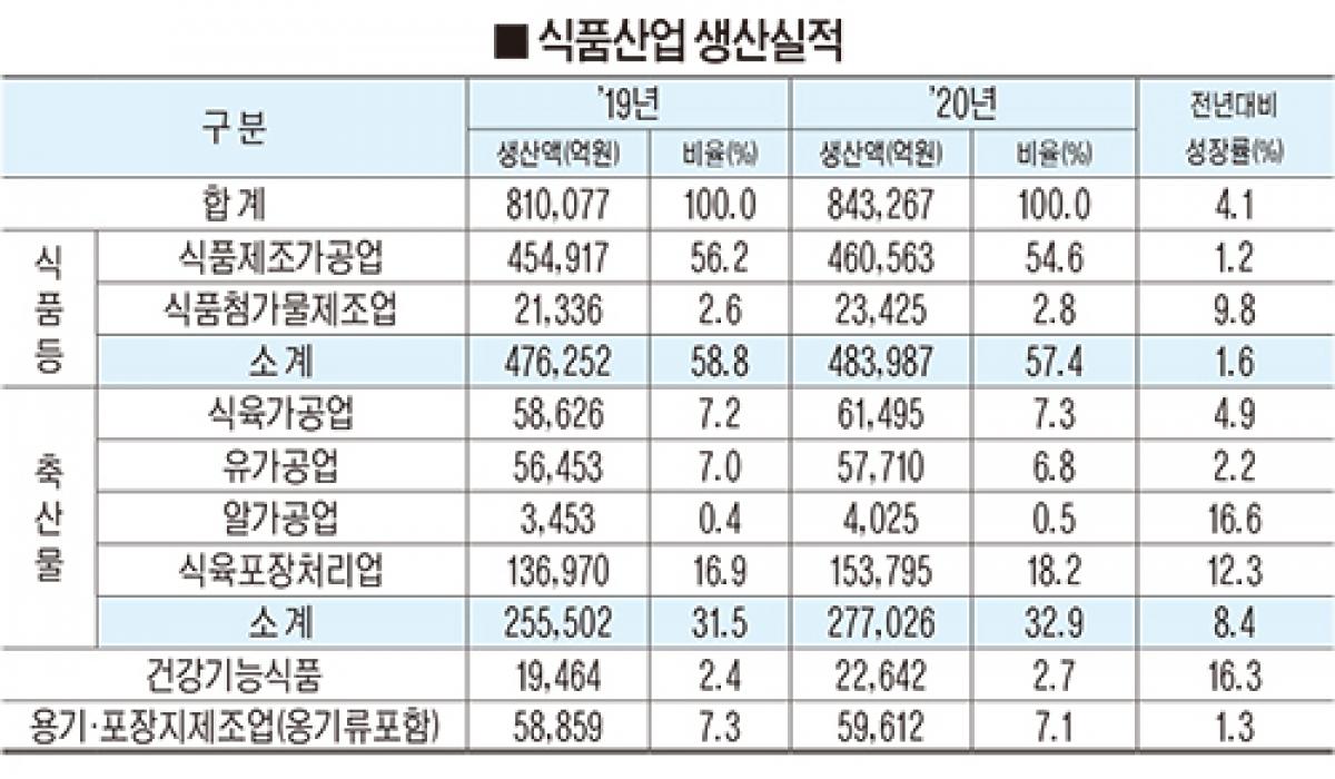 국민 식탁, 주식은 ‘축산물’ 지난해 식품산업 생산실적 1~3위 ‘싹쓸이’…축산물 생산액, 전체 33% 비중 축산업은 농업생산액의 40%…농촌경제 주도 산업 비중·가치 걸맞은 육성정책 뒷받침돼야 우리나라 사람들이 가장 많이 먹는 식품은 뭘까. 그 맨 앞에 돼지고기가 섰다. 이어 쇠고기, 양념육이 뒤따르고 있다. 식품의약품안전처(처장 김강립)가 지난 7월 29일 발표한 ‘2020년 식품산업 생산실적’에 따르면 축산물(유가공, 알가공, 식육가공, 식육포장처리업 포함) 생산실적은 27조7천26억원에 달한다. 전년 2019년 25조5천502억원 대비 8.4% 늘었다. 전체 식품산업 84조3천267억원 중 32.9%에 해당한다. 특히 돼지고기 포장육(7조2천344억원), 쇠고기 포장육(5조4천585억원), 양념육류(양념육·분쇄가공육제품·갈비가공품·천연케이싱 포함, 3조6천999억원) 등 축산물 세품목은 식품별 생산실적 1~3위를 싹쓸이했다. 즉석섭취·편의식품류, 소스류, 빵류, 수산물가공품, 과자, 커피, 소주 등 다른 식품을 모두 제꼈다. 닭고기 포장육(2조2천715억원, 7위), 우유류(1조6천924억원, 12위), 햄류(1조1천74억원, 20위) 등도 20위권 안에 포진했다. 지난해의 경우, 코로나19 여파로 인해 돼지고기 판매가격이 오르고 명절 선물세트로 햄류가 인기를 끈 까닭이 있다. 하지만 이러한 축산물 활약은 결코 ‘반짝 현상’이 아니다. 수년째 이어지고 있는 대세(大勢)다. 전년 2019년을 들여다봐도 전체 식품산업 생산실적 중 축산물이 31.5%를 차지했고, 상위 3개 품목 역시 축산물 몫이었다. 축산물은 이렇게 식품산업에서 맹위를 떨치고 있다. 이제 축산물이 국민 주식(主食)이라고 해도 과언이 아닐 정도다. 더불어 축산업은 이미 농촌경제 주축으로 확고히 자리잡았다. 2019년 축산업 생산액은 19조7천706억원으로, 농림업 전체 생산액 52조1천947억원에서는 37.8%, 임업을 뺀 농업 생산액 49조6천799억원 가운데서는 39.8%나 된다. 아울러 축산업 중 돼지고기, 한우, 우유, 닭, 계란 등은 매년 품목별 생산액 상위 10위권 안을 수년째 놓치지 않고 있다. 축산업이 농촌을 지키는 원동력이면서 버팀목이라는 것을 여실히 보여준다. 하지만 이러한 축산업 위상에도 불구, 축산업에 대한 정책적 지원과 배려는 부족하다는 지적이다. 예를 들어 축산물과 축산업이 식품산업 생산실적과 농업 생산액에서 모두 30%를 훌쩍 넘어서고 있지만, 농식품부 전체 예산 중 축산정책국·방역정책국 예산은 10% 수준에 머물고 있다. 게다가 냄새, 환경 등 관련 규제는 갈수록 거세지고 있는 실정이다. 축산인들은 우리 스스로 노력과 함께 정부의 육성정책, 규제완화 등이 보태진다면 앞으로 식품산업과 농촌경제에서 축산업 가치와 역할은 더욱 확대될 것이라고 강조했다. ![]() [출처: 축산신문 2021. 8. 4.] |