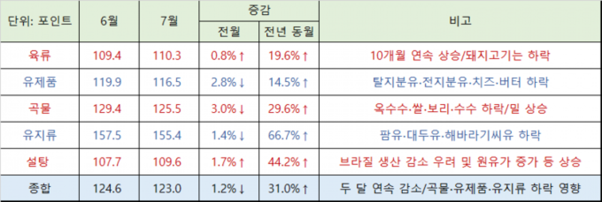 7월 세계식량가격지수 전월 대비 1.2% 하락한 123.0포인트...육류는 10개월 연속 상승, 돼지고기는 하락