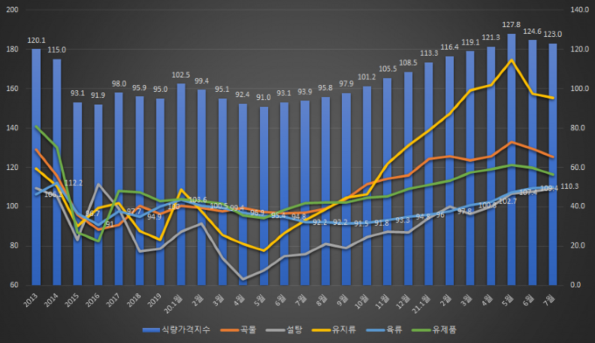 그외 7월 유제품과 유지류, 설탕은 각각 116.5, 155.4, 109.6 포인트를 나타내었습니다.