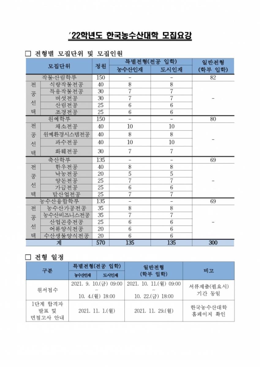 한국농수산대학(총장 조재호)9월과 102022학년도 신입생을 선발할 원서 접수를 진행한다.