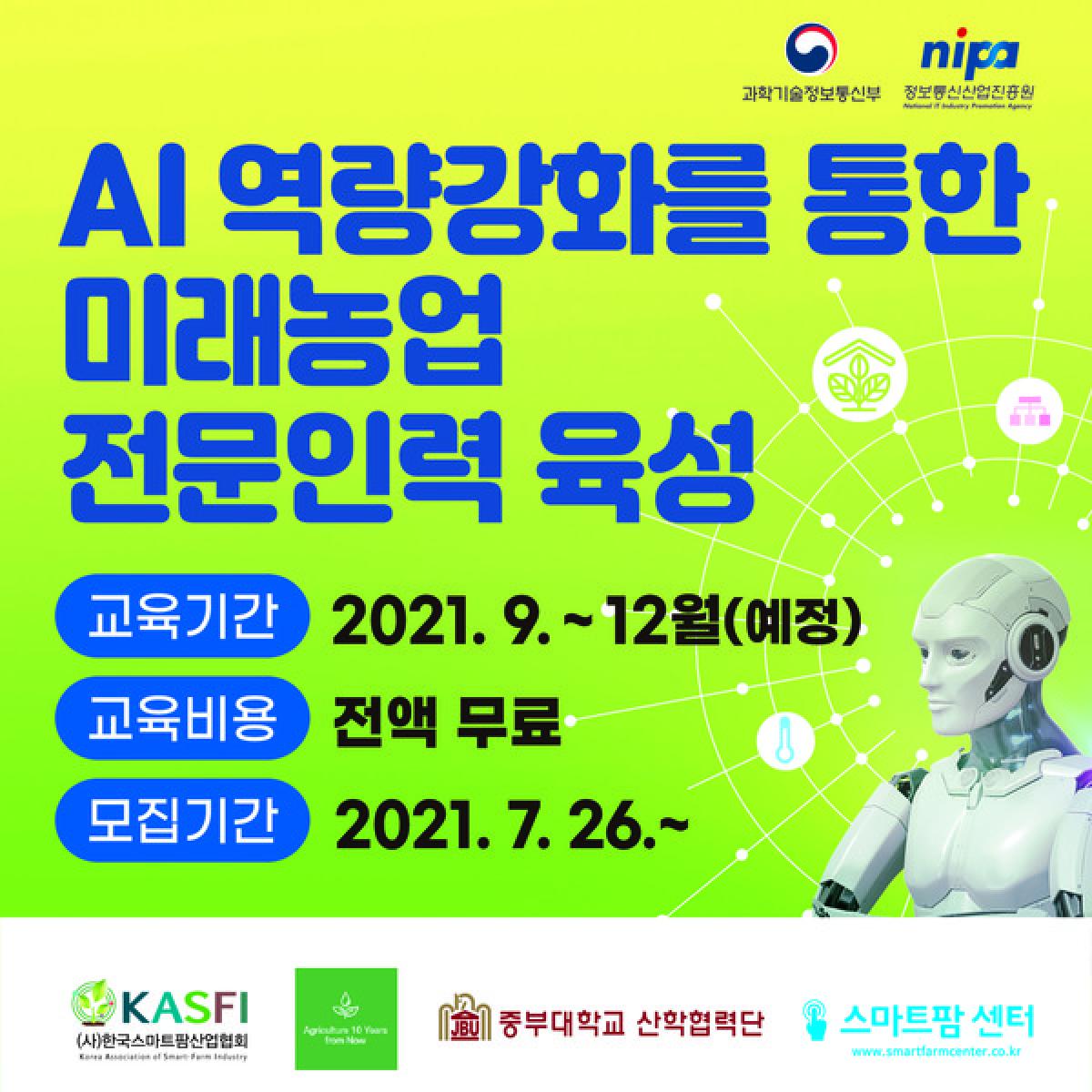 교육비용은 전액 무료이며, 자세한 사항은 미래농업 AI전문인력육성사업단help_aaic@naver.com)으로 문의하면 된다.