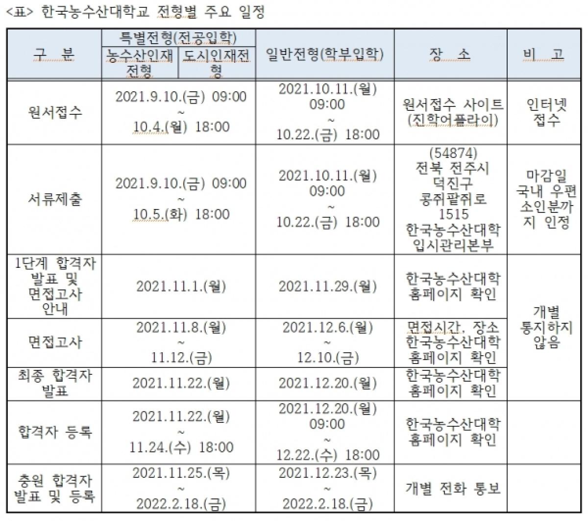 국립 한국농수산대학(총장 조재호)9·10월에 수시모집 원서접수를 통해 2022학년도 신입생 570명을 모집한다.