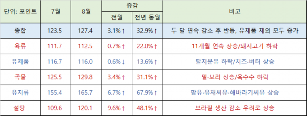 8월 세계식량가격지수 전월 대비 3.1% 상승한 127.4포인트..육류는 11개월 연속 상승, 돼지고기는 또 하락