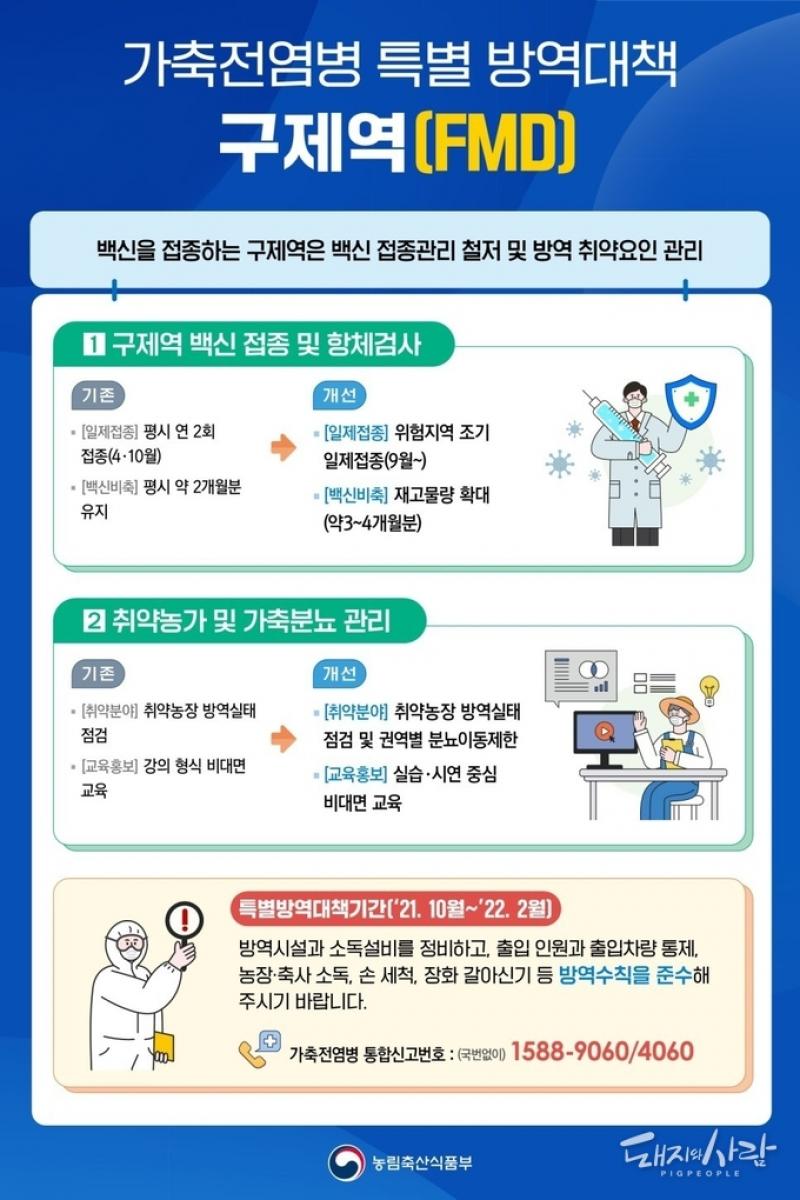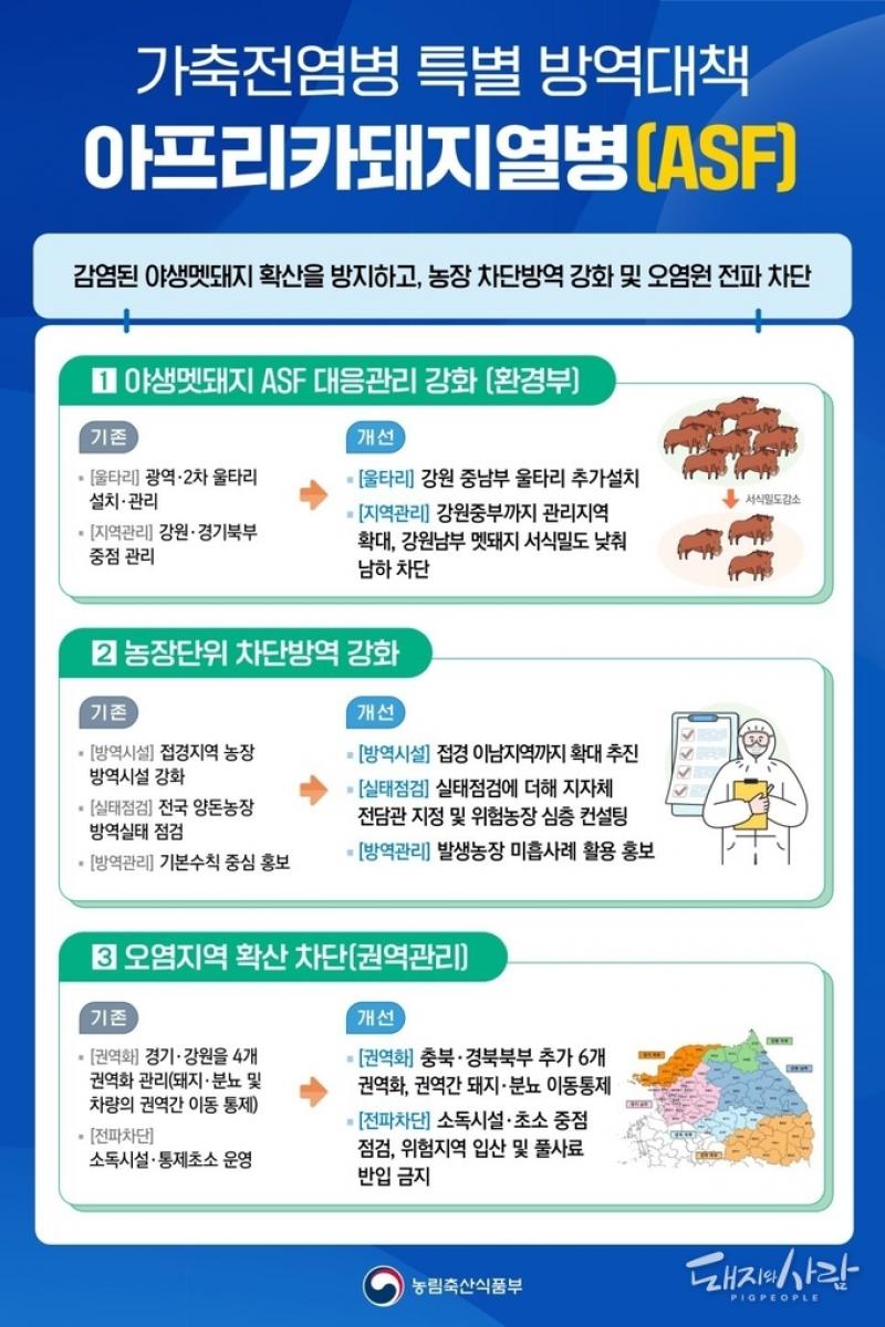 ASF, 멧돼지 확산 차단과 농장 방역 강화...구제역, 백신 보강 및 점검, 권역간 생분뇨 이동제한 실시