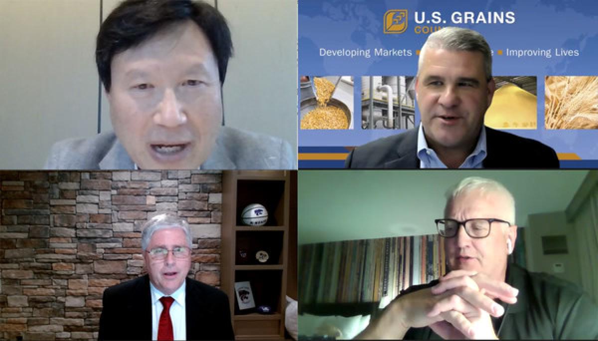 미국 현지 옥수수 생산 관계자들과 김학수 미국곡물협회 서울사무소 대표(사진 맨 처음) 등이 웨비나를 통해 발표하고 있다.