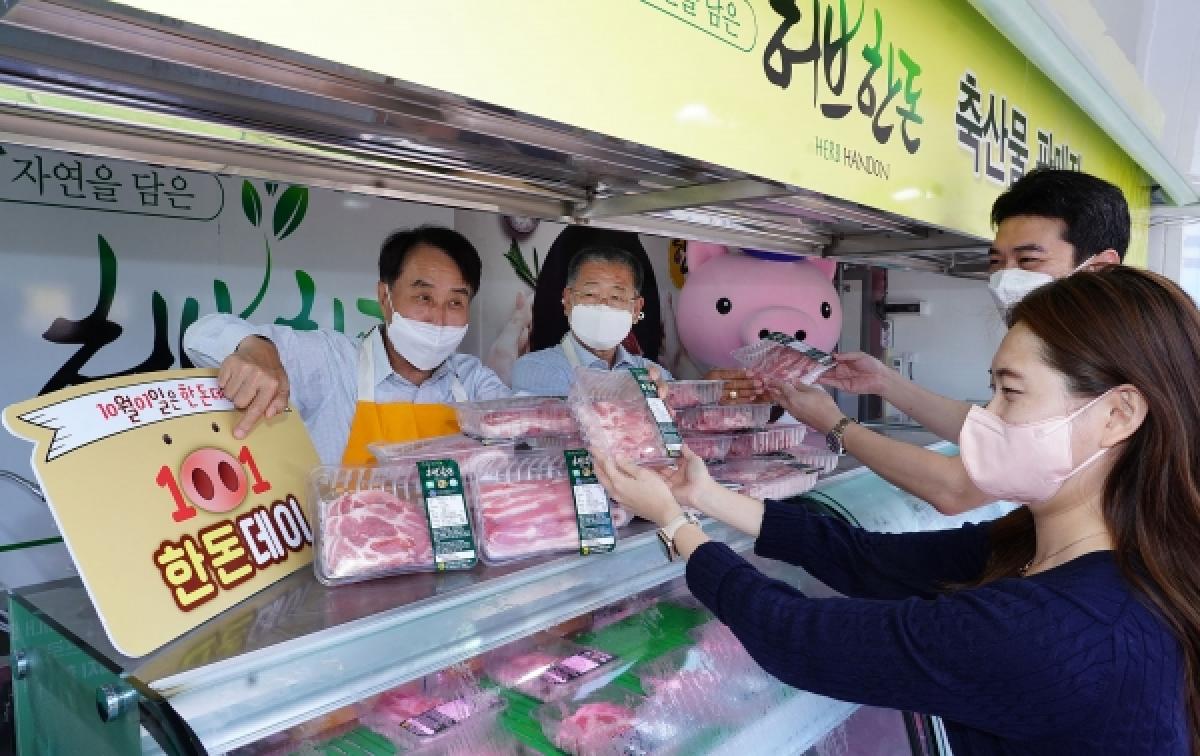 특히, 행사 첫 날인 1일에는 한돈자조금 하태식 위원장과 서울경기양돈조합 이정배 조합장이 직접 판매 행사에 참여해 눈길을 끌기도 했다.