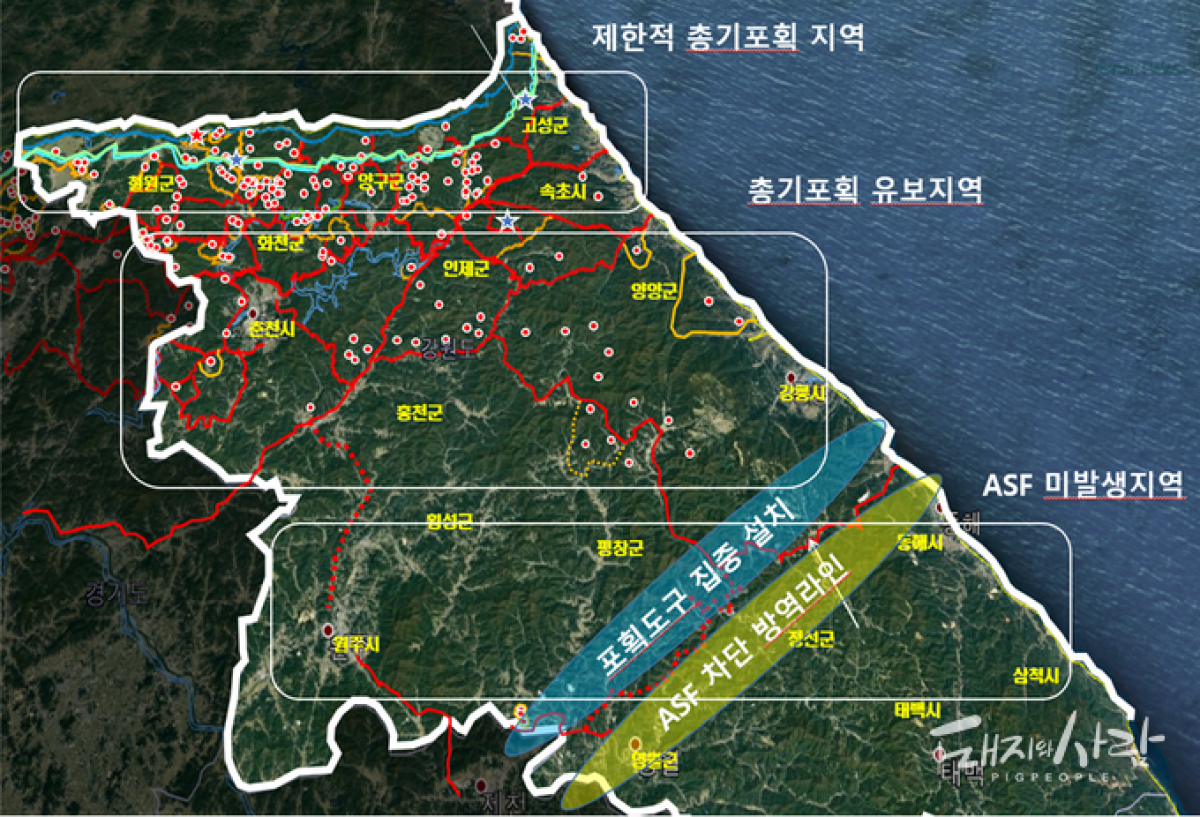 한편 강원도는 올 10월부터 내년 3월까지 6개월간을 '동절기 야생멧돼지 집중포획' 기간을 내걸고 멧돼지의 대대적인 포획과 확산루트 전면 봉쇄 추진에 나섰습니다. 성공 여부는 현재로선 불투명합니다. 정선에서 양성 멧돼지가 나온 상황에서 정선을 '클린존'으로 분류, 적극적인 총기 포획을 실시한다는 계획도 담아 있습니다.