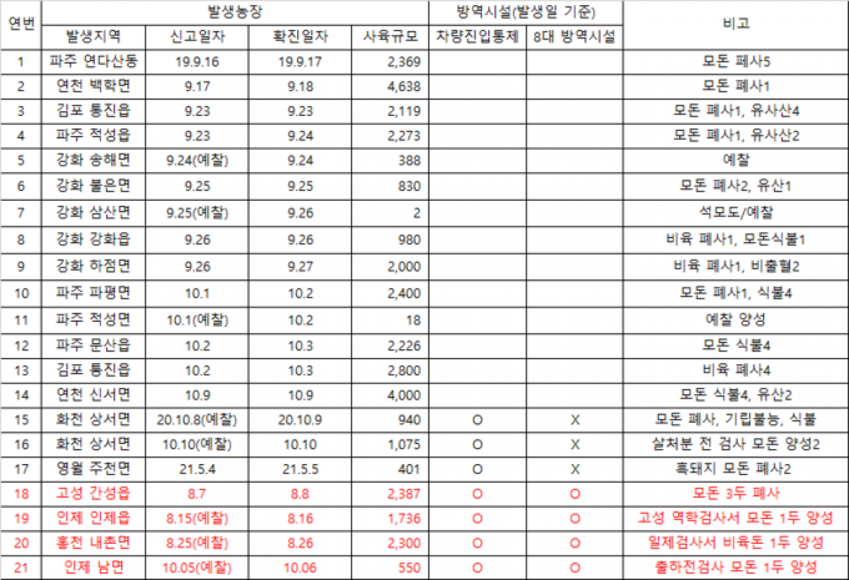 이번 인제 농장 ASF 발생은 사육돼지에서는 역대 21번째 사례입니다. 올해에만 5번째 사례입니다. 지난 강원도 홍천 농장 발생(8.26) 이후 41일 만에 추가 발생입니다.