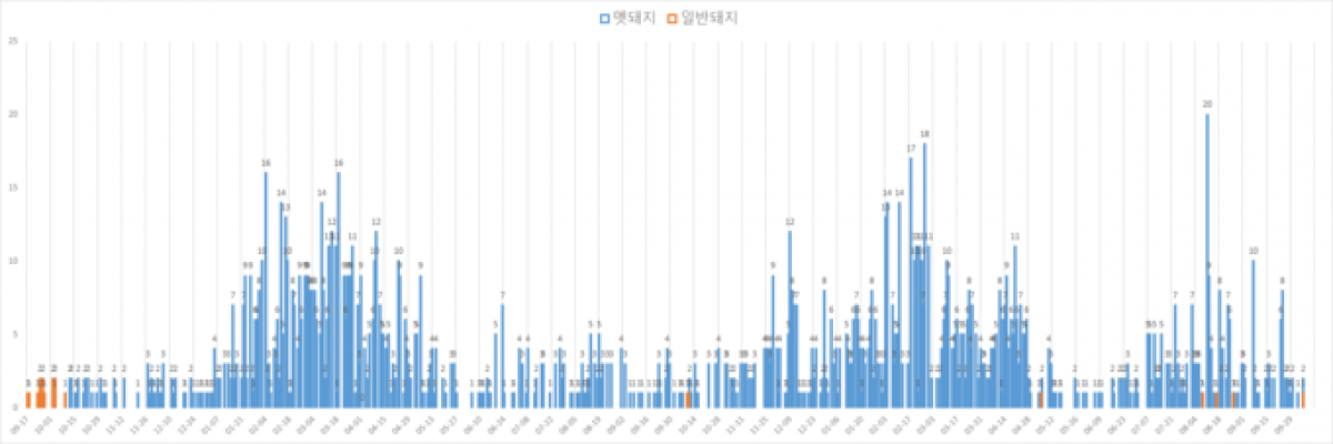 일별 국내 ASF 발생건수 집계(주황 사육돼지, 파랑 멧돼지)@돼지와사람 편집