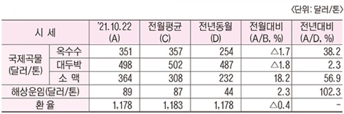 최근 곡물 동향에 따르면 국제 곡물가가 지난 2020년 하반기부터 지속적으로 상승하기 시작해 지난 1022일 현재 옥수수 가격이 351달러(톤당)로 전년동월 254달러 대비 38.2% 올랐다. 대두박과 소맥도 마찬가지. 대두박은 498달러로 전년동월 487달러 대비 2.3%, 소맥 역시 364달러로 전년동월 232달러 대비 56.9%나 각각 올랐다. <표 참고>