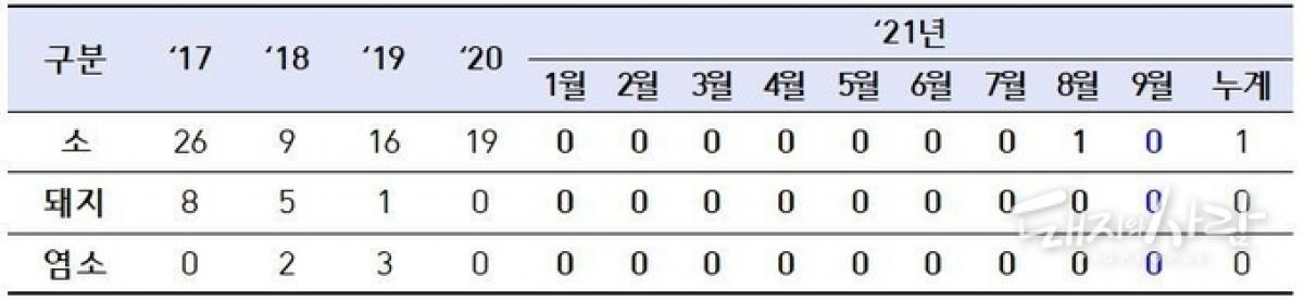 농림축산검역본부의 '219월 구제역 혈청예찰 결과'에 따르면 9월 소·돼지·염소 등 우제류 5,260 농가 대상 약 6만여 두에 대한 검사에서 감염항체가 확인된 건수는 모두 2농가 37건으로 나타났습니다.