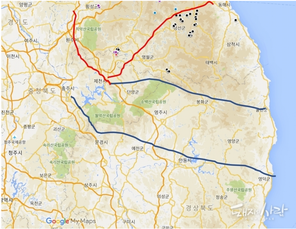 환경부의 이같은 광역울타리 추가 설치 계획은 경기와 강원에 국한된 ASF 양성멧돼지가 충북 북부와 경북 북부로 확산될 또는 이미 확산되었을 가능성이 매우 높기 때문으로 풀이됩니다. 최근 10월과 11월 정선과 삼척, 영월 등에서 새롭게 추가된 ASF 양성멧돼지는 모두 광역울타리 경계 너머에서 포획발견된 사례입니다. 정부의 차단 울타리가 재차 뚫린 것입니다.