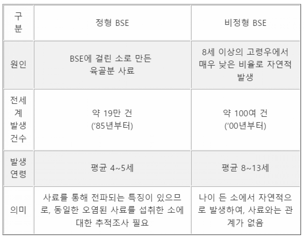 한편, 비정형 BSE는 오염된 사료를 통해 전파되는 정형 BSE와 달리 주로 8세 이상의 고령 소에서 매우 드물게 자연 발생하며, 타 개체로 전파되지 않는 것이 특징이다.