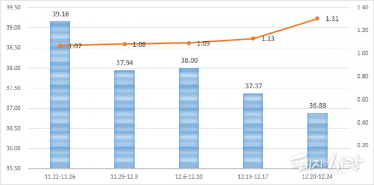 최근 주간 등급판정두수(파란색 막대) 및 경매두수(주황색 선). 단위는 만 두@축평원 자료 편집
