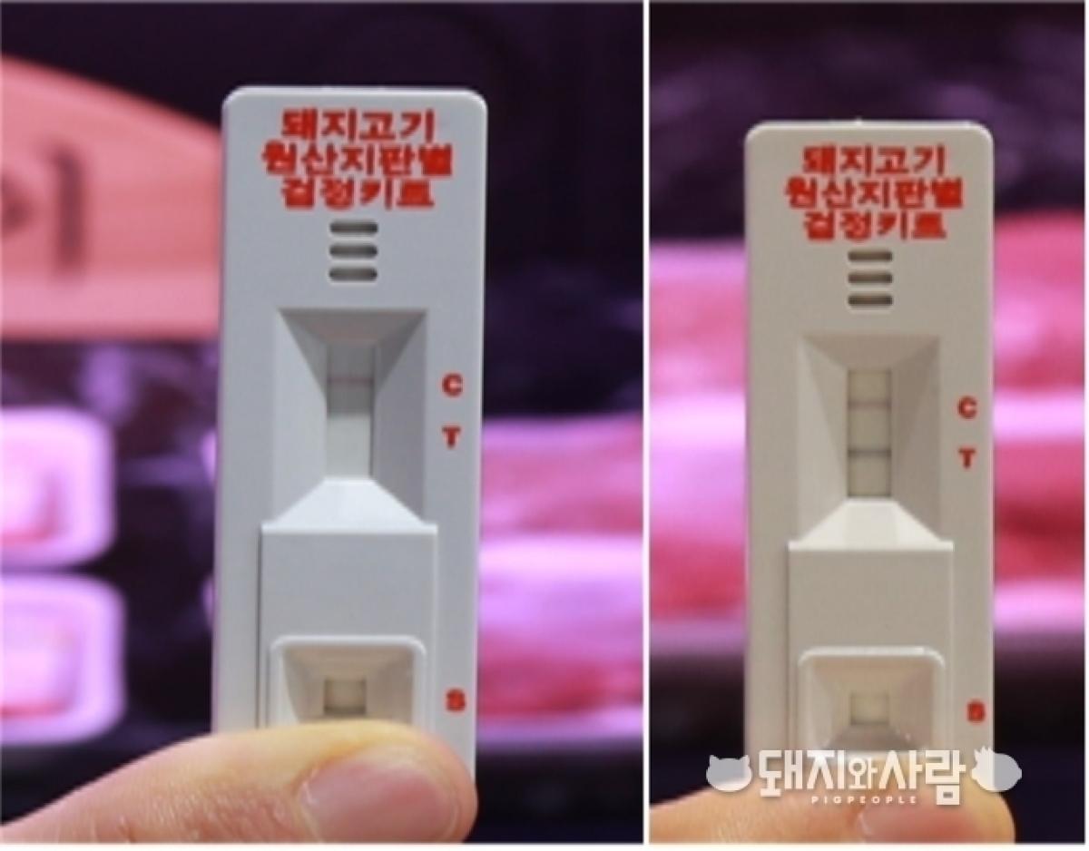 돼지고기 원산지 검정키트는 돼지열병 항체 유무를 통해 감별(왼쪽 수입산, 오른쪽 국내산)@농관원