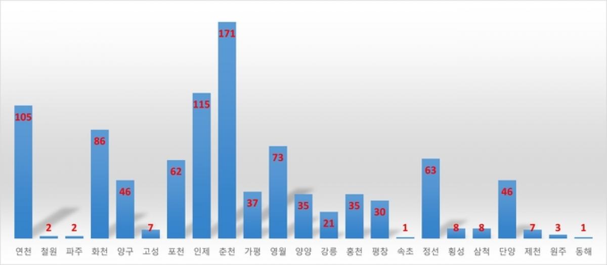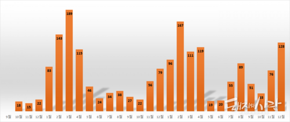 지난해 ASF 양성멧돼지 발견건수 23개 시군서 모두 964건 2021년 경기 206건, 강원 705건, 충북 53건....올해 확산세 지속 전망 지난해 ASF 양성멧돼지가 경기·강원·충북 등 23개 시군에서 모두 964건 발견된 것으로 집계되었습니다. 964건은 '19년 55건, '20년 856건 대비 모두 증가한 결과입니다. 지난해 정부와 지자체의 집중적인 멧돼지 포획에도 불구하고 이같이 양성멧돼지가 증가한 이유는 지역적으로 확산되면서 발견되었기 때문으로 풀이됩니다. ▲ 2021년 시군별 양성멧돼지 발견건수@환경부 자료 편집 경기도는 연천과 파주, 포천, 가평 등 4개 시군에서 모두 206건 발견되었는데 연천이 105건으로 가장 많고, 이어 포천 62건, 가평 37건, 파주 2건 등의 순으로 나타났습니다. 경기도는 다른 광역시도에 비해 상대적으로 양성멧돼지 확산에 효과적으로 대응하고 있다는 평가가 나옵니다. 파주의 경우 지난해 4월, 포천은 지난해 7월 이후 추가 양성멧돼지 발견이 없는 상황입니다. 연천의 경우도 최근 6개월간 발생건수가 불과 3건에 그치고 있습니다. 무엇보다 새롭게 확산된 시군이 없다는 점이 주목됩니다. 강원도는 경기도와 비교해 매우 대조적인 상황입니다. 지난해 영양, 강릉, 홍천, 평창, 속초, 정선, 횡성, 삼척, 원주, 동해 등 도내 10개 시군으로 양성멧돼지가 확산되어 전체 18개 시군 가운데 태백을 제외한 17개 시군이 양성지역으로 분류되었습니다. 그리고 지난달 도 전체가 ASF 중점방역관리지구로 지정되었습니다. 강원도 705건 가운데 춘천이 가장 많은 171건입니다. 이어 인제가 115건, 화천 86건, 영월 73건, 정선 63건, 양구 46건, 양양과 홍천이 각 35건, 평창 30건, 강릉 21건, 횡성과 삼척이 각 8건, 고성 7건, 원주 3건, 철원 2건, 동해와 속초 각각 1건 등의 순입니다. 이 가운데 철원은 4월, 화천과 양구, 속초는 8월, 고성은 9월을 마지막으로 추가 발견이 없습니다. 반면, 영월과 정선을 중심으로 집중적으로 발견되고 있습니다. 충북은 강원도 ASF 양성멧돼지 상황의 연장선입니다. 지난해 11월 새롭게 추가 확산되어 세 번째 양성멧돼지가 발견된 광역시도가 되었습니다. 지금까지 단양과 제천에서 각각 46건, 7건 발견되었습니다. 지난해 ASF 양성멧돼지 확산과 관련해 눈여겨 봐야 할 점이 또 있습니다. 바로 국립공원으로까지 확산된 점입니다. 4월 설악산에 이어 7월 오대산, 11월 월악산 등에서 첫 발견되었습니다. 현재 소백산과 속리산, 치악산 국립공원이 추가 확산 위기에 놓여 있습니다. ▲ 국내 ASF 양성멧돼지 발견지점@구글지도 편집 올해에도 ASF 양성멧돼지의 확산은 계속 이어질 전망입니다. 최근 정부가 5단계 광역울타리 건설을 마쳤지만, 확산 속도를 늦출 뿐이지 확산 자체를 막을 수 없다는게 일반적인 견해입니다. 당장 충북과 경북, 경기 이남이 위험 지역으로 분류됩니다. 정부도 이같은 상황을 애써 부정하지 않습니다. 이 때문에 정부가 양돈 농가에 "기본적으로 방역에 필요한 핵심 시설을 갖추고, 정기적인 소독‧관리로 바이러스의 유입을 차단해야 한다"고 강조하는 이유입니다. 농식품부 김현수 장관은 올해 신년사에서 "가축질병으로 가장 큰 피해를 보는 것도, 가축질병을 가장 먼저 막아낼 수 있는 것도 농가이다. 실질적 방역 주체인 농가를 중심으로 자율적 방역체계를 완성하는 것, 바이러스와의 전쟁에서 승리하기 위한 마지막 열쇠가 될 것이다"고 밝혔습니다. ![]() ▲ ASF 양성멧돼지 월별 발견건수@환경부 자료 편집 한편 지난달 12월 ASF 양성멧돼지 발견건수는 전달보다 52건이 증가해 모두 128건을 기록했습니다. 두 달 연속 증가이며, 멧돼지 번식 기간인 겨울 기간 더 늘 전망입니다. 지금까지 전국적인 양성멧돼지 발견건수는 모두 1,875건입니다(경기 654, 강원 1168, 충북 53). [출처: 돼지와사람 2022. 1. 3.] |