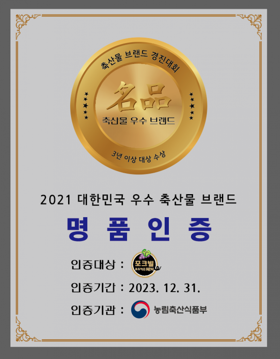 대전충남양돈농협의 브랜드 「포크빌포도먹은돼지」는 2023년 농림축산식품부에서 인증하는 ‘명품’브랜드를 이어나가면서 대한민국 대표 한돈 브랜드의 견인 역할을 하고 있다.