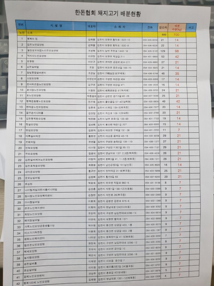 한돈농가 이미지 개선사업 결과보고 행사일시: 2021.11.18 전달처 : 김천관내 복지시설(노인복지시설) 물 량 : 돼지고기(전지,후지) 700kg