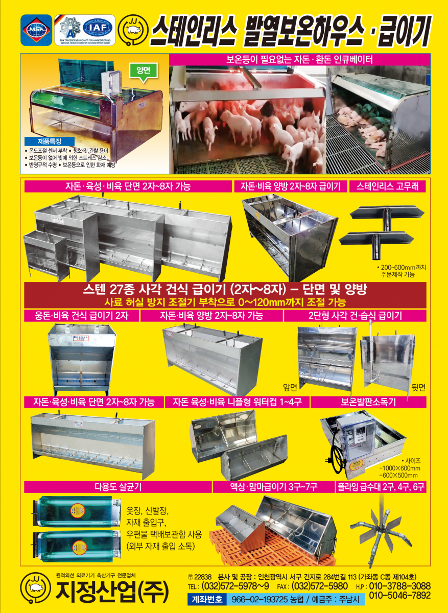 • 스테인리스 발열보온하우스, 급이기, 워터컵, 보온발판소독기, 살균기, 거세보정틀, 스테인리스 고무래 등