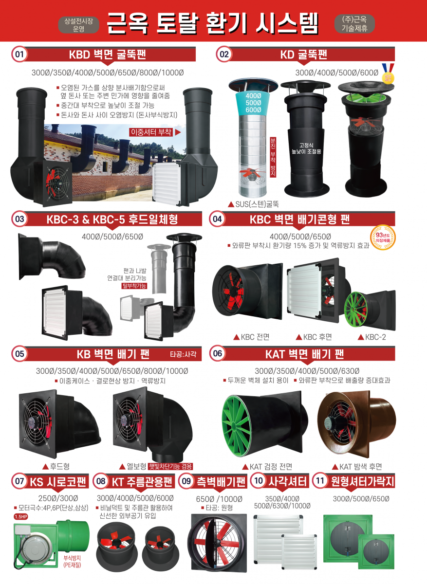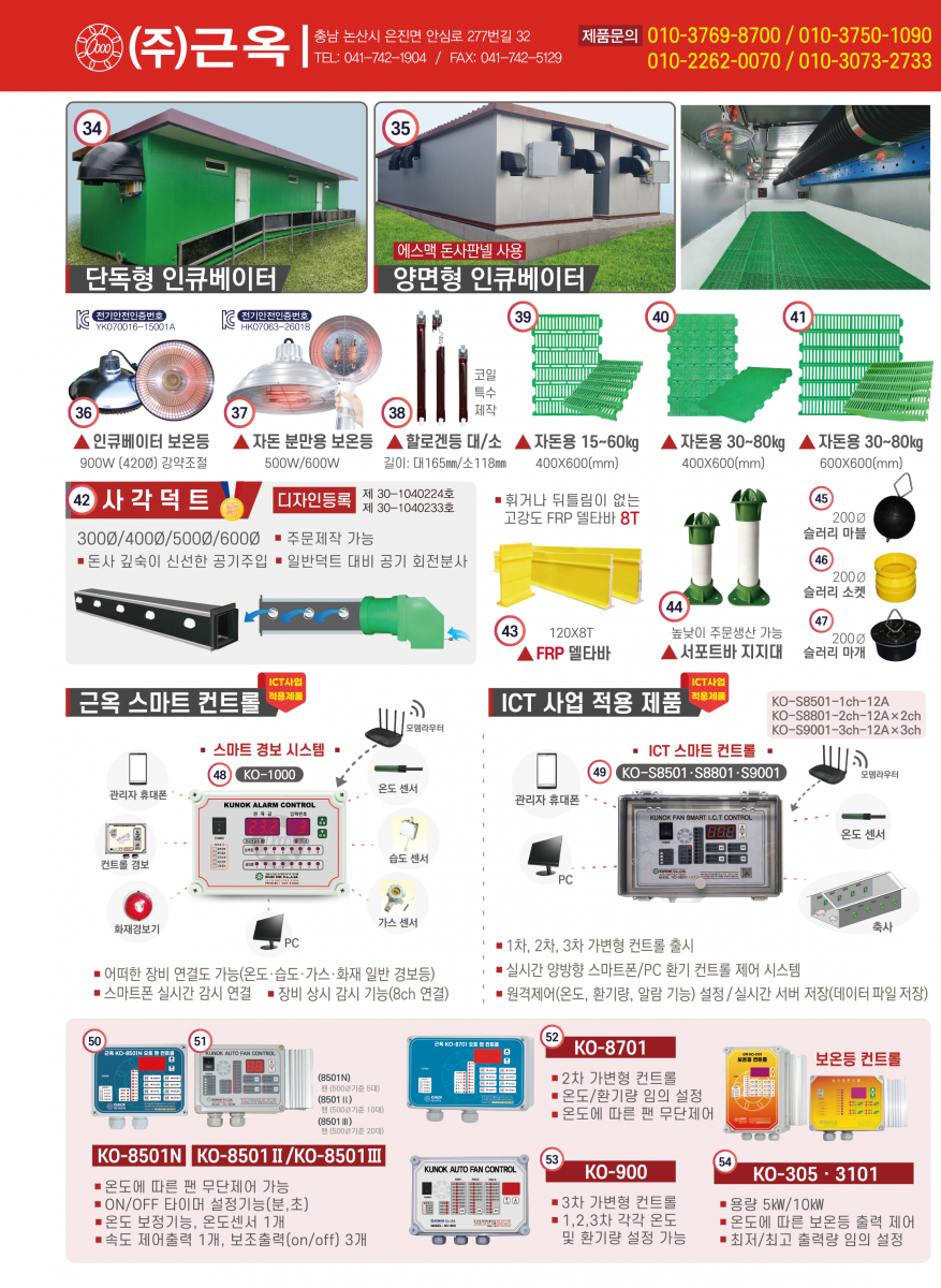 • 굴뚝휀, 배기휀, 후드, 공기창, 쿨링패드, 인큐베이터, , 쿨링냉방시스템, 바닥재, ICT 컨트롤러 등