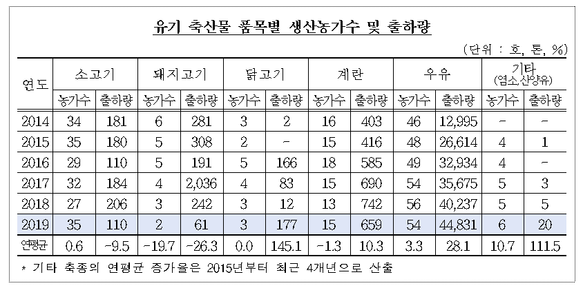 ㅇ 품목별 출하량을 보면, 우유가 출하량의 대부분(‘19: 97.8%)을 차지하였으며, 계란, 닭고기 등은 증가하는 반면, - 소고기와 돼지고기는 등급 판정의 영향으로 감소 추세를 보이고 있다. * 유기축산물 품목별 출하량(’19년, 톤, %) : 우유 44,831(97.8) > 계란 659(1.4) > 닭고기 177(0.4) > 소고기 110(0.2) > 돼지고기 61(0.1) > 산양유 등 20(0.04) 순 - 특히, 최근 일반 우유의 소비량은 감소하고 있으나, 유기 우유의 출하량은 지속적으로 증가(연평균 28.1%)하고 있어서, 유기 우유에 대한 소비자의 관심이 지속 상승하는 것으로 나타났다. - 또한, 건강에 대한 관심 증가 및 즉석편의식품의 샐러리 키트 제품이 식사 대용으로 많이 활용되면서 유기 닭고기의 출하량이 전년대비 크게 증가(’18: 12톤 → ‘19: 177톤)한 것으로 나타났다.