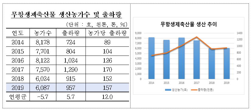 □ (무항생제축산물) ’19년 기준 무항생제축산물 생산농가는 6,087호로 최근 5년간 감소(‘14: 8,178호 → ’19: 6,087호, 연평균 △5.7%)하였으나, 출하량은 ‘17년 살충제 계란 사건 이후 감소(’17: 1,290천톤 → ’18: 915천톤)하였다가 최근 회복세(’19: 957천톤)를 보이고 있다.