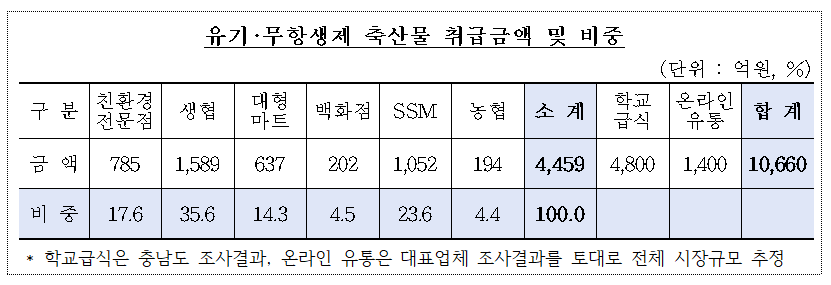 <2> 유기‧무항생제 축산물 유통 현황 □ 유기‧무항생제 축산물의 시장규모는 약 1조 660억원으로 추정되며, 학교급식(4,800억원, 45.0%), 소매 유통업체(4,459억원, 41.8%), 온라인 유통(1,400억원, 13.2%) 순으로 나타났다. ㅇ 유기‧무항생제 축산물을 취급하는 소매 유통업체 13개소를 대상으로 조사한 2019년도 유기‧무항생제 축산물의 매출액 규모*는 약 4,459억원으로 추정된다. * 아이쿱‧한살림 등 생협이 전체의 35.6%, GS더프레시‧롯데슈퍼 등 슈퍼마켓(SSM)이 23.6%, 초록마을‧올가홀푸드 등 친환경전문점이 17.6%, 대형마트가 14.3%, 백화점이 4.5%, 농협이 4.4%를 차지 - 일반적으로 생협 및 친환경전문점을 통한 매출액 비중이 높으나, 최근 들어, 전국 유통망을 갖춘 슈퍼마켓(SSM) 및 대형마트의 매출액 비중도 증가하고 있는 상황이며, - 코로나 19 이후 마켓컬리 등 온라인 유통업체의 판매량도 지속적으로 증가 추세에 있는 것으로 조사되었다. * (A 온라인 유통업체 매출동향) ‘20.1〜11월 기준 유기·무항생제 축산물의 매출액은 163억 수준(전년 동기 대비 178% 증가)으로 조사