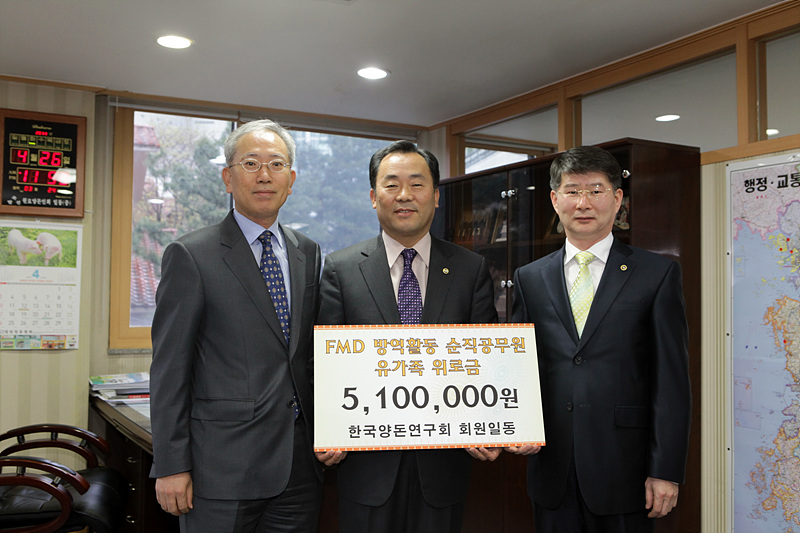 양돈연구회(회장 강화순)회원 일동이 지난 426일 대한양돈협회를 방문하여 FMD(구제역)방역 과정 중에서 숨진 공무원 유가족들에게 써달라며, 510만원의 성금을 전달해 왔다.