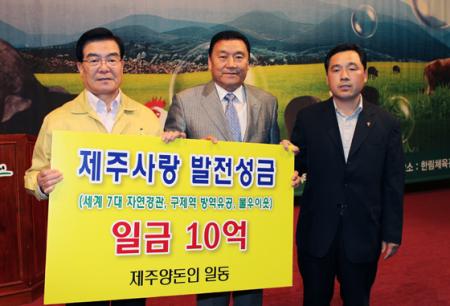 ○ 제주특별자치도(시장 우근민)에 따르면 제주양돈인들이 지난 6월 17일 제주시 한림체육관에서 열린 ‘2011 구제역 특별방역 한마음 행사’에서 십시일반 모은 ‘제주사랑 성금 10억원’을 우근민 지사에게 기탁했다고 밝혔다.