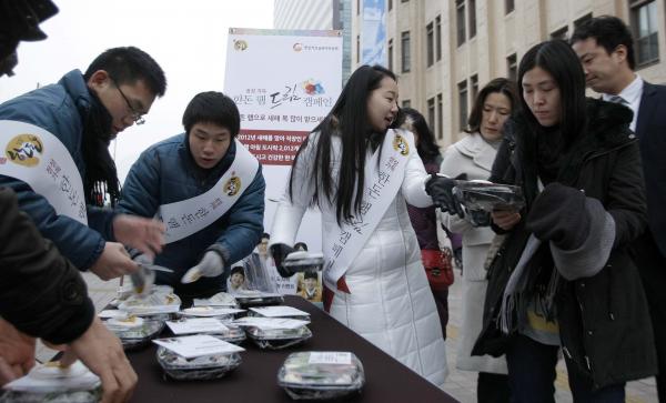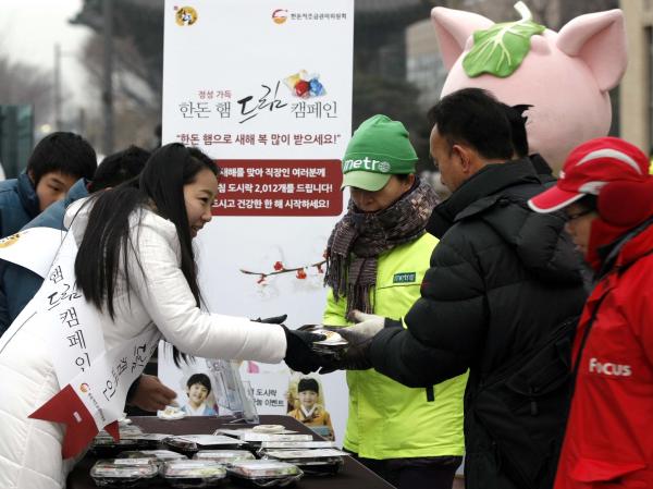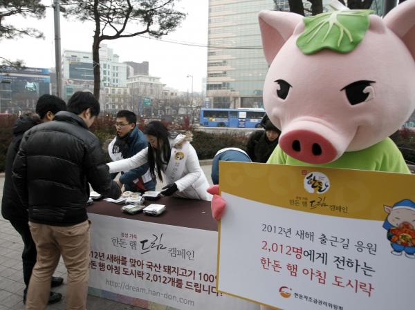 한돈자조금관리위원회(위원장 이병모, 대한양돈협회장)는 지난 3일 오전 종각과 광화문역 일대에서 새해 첫 출근길 이벤트 ‘한돈햄 도시락 2012개를 드립니다’ 란 제목으로 한돈햄으로 만든 도시락 2012개를 출근길 직장인들에게 제공하고, 한돈 농가에게 새해 덕담을 보내는 이벤트를 진행했다.