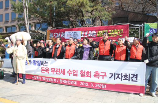 3/26일 돈육 무관세 수입 철회 농성(투쟁 1일차) 돈육 무관세 수입 철회 기자회견 및 비대위, 출하 중단 결정 등 ▶ 양돈협, 돈육 무관세 수입 철회 기자회견 개최 및 연좌 농성 돌입 대한양돈협회(회장 이병모)는 3월 26일 여의도 국회의사당 국민은행앞에서 오전 11시에 “돈육 무관세 수입 철회 기자회견”을 개최하였다. 이 자리에는 대한양돈협회 이병모 회장, 통합진보당 윤금순 최고위원(전 여성농민회장), 한국농민연대 이준동 상임대표, 축산관련단체협의회 이승호 회장을 비롯한 양돈협회 회장단, 각 도협의회장, 이사, 지부장 등 30여명이 참석하여, 양돈농가를 말살하려는 정부의 돈육 무관세 수입 조치를 강력히 규탄하고 연좌농성에 돌입했다.