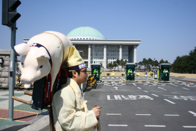 (여의도 국회의사당앞, 돼지지게 1인 시위 장면) |