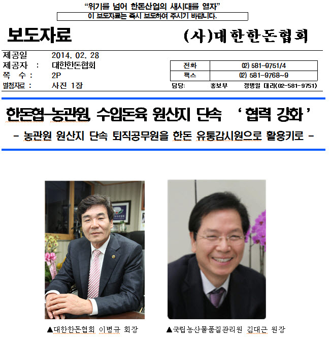 □ 대한한돈협회 이병규 회장은 지난 2월 27일 국립농산물품질관리원 김대근 원장과 면담을 갖고, 수입돈육 둔갑판매 근절을 위한 원산지 단속 강화를 위해 양 기관의 협력을 강화키로 했다.