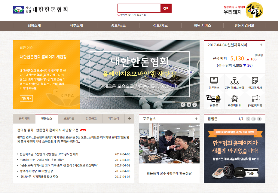 대한한돈협회가 한돈농가와의 소통을 강화하기 위해 홈페이지를 개편하고 4월부터 새롭게서비스 한다. 대한한돈협회(회장 이병규)는 단순하면서도 정보를 쉽고 빠르게 확인할 수 있도록 홈페이지를 전면 개편하고 스마트폰에서도 접근이 가능한 모바일웹을 개발하여 4월 5일부터 제공한다고 밝혔다. # 심플하고 깔끔한 메뉴 이용자 편리성 증대 ◌ 이번 개편에서는 홈페이지 주 이용자인 ▲한돈농가, ▲지역실무자, ▲한돈관련기업이 원하는 정보를 빠르고 정확하게 접근할 수 있도록 메뉴를 새롭게 구성해 접근성과 편의성을 높인 것이 특징.