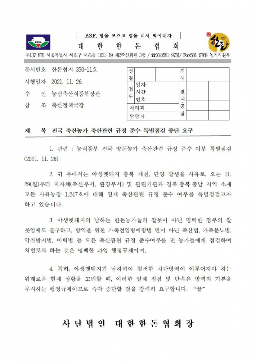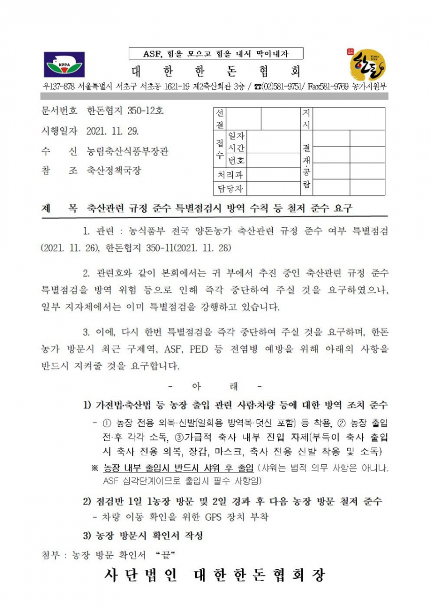 [알림] 양돈농가 특별점검 관련 협회 대응활동